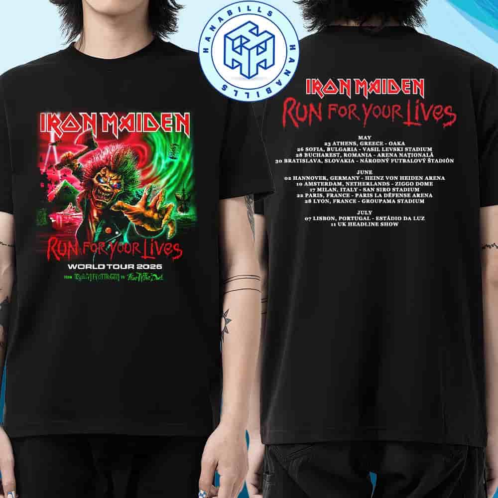 Iron Maiden Run For Your Lives World Tour 2026 Eddie Axe Fear Of The Dark Dates List Two Sided Unisex T-Shirt